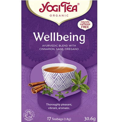 Dobre samopoczucie, szczęście, dobrostan - zaczynają się od chęci doświadczenia ich. Ta herbata zabierze Cię na krótki relaks w słonecznej atmosferze. Z rozgrzewającym cynamonem i aromatyczną szałwią smak YOGI TEA® Wellbeing przywodzi na myśl wypoczynek nad Morzem Śródziemnym. Dzięki trawie cytrynowej i oregano możesz poczuć smak pełni życia i czerpać świeżą inspirację i energię z głębokiego poczucia dobrostanu!