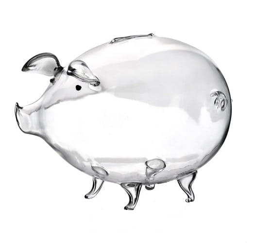 Świnka skarbonka. Wykonana ze szkła borokrzemowego, bezbarwna i błyszcząca powierzchnia szkła.