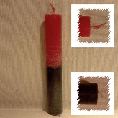 oznacza to, że świeca ma dwa knoty. Jeden po stronie czerwonej, drugi po stronie czarnej. Przed spaleniem jeden z knotów odetniesz, w zależności od tego którą stronę wybierzesz jako pierwszą do spalenia. Jeśli chcesz żeby Twój rytuał rozpoczynał się od spalenia świecy koloru czerwonego to odetniesz knot czarny. I odwrotnie...