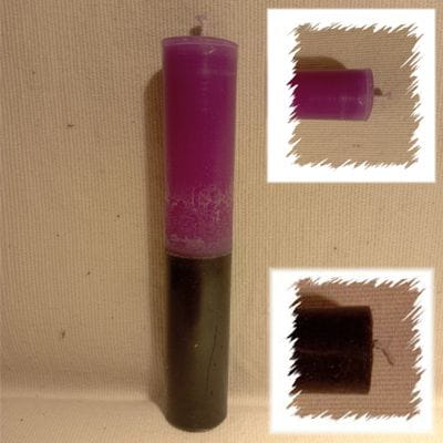 oznacza to, że świeca ma dwa knoty. Jeden po stronie fioletowej, drugi po stronie czarnej. Przed spaleniem jeden z knotów odetniesz, w zależności od tego którą stronę wybierzesz jako pierwszą do spalenia. Jeśli chcesz żeby Twój rytuał rozpoczynał się od spalenia świecy koloru fioletowego to odetniesz knot czarny. I odwrotnie...