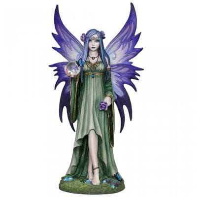 ...boso na poszyciu lasu, gdy powoli idzie naprzód. Suknia tej Wróżki... długa zielona, obszyta złotem zwisa do samego dołu. W lewej ręce trzyma fioletową różę, pasującą do jej delikatnych fioletowych skrzydeł, które są rozpostarte za nią, a w prawej trzyma kryształową kulę. Wokół niej fruwają niebieskie motyle, jeden osiada na krysztale, a nad jej włosami wisi delikatny złoty łańcuszek, trzymający pentagram na jej czole. Wróżka patrzy na ciebie spokojnie... Ta urocza figurka, odlana z najwyższej jakości żywicy, a następnie fachowo ręcznie malowana, emanuje aurą spokoju i magii.